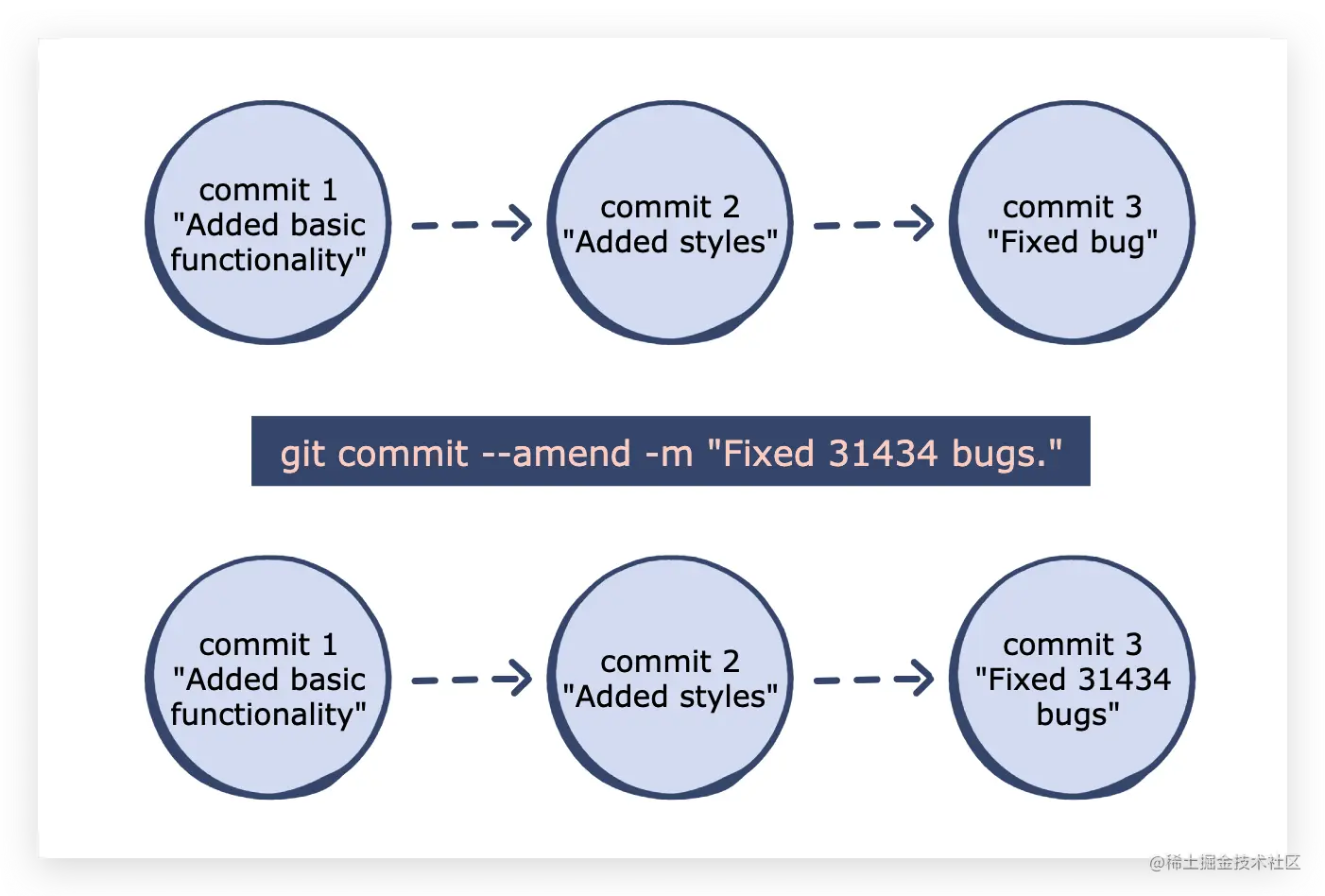 我们可能会在某次提交的时候遗漏了某个文件,当我们再次提交就可能会多处一个无用的 commit-id,大家都这样做,git log 慢慢就会乱的无法追踪完整功能了