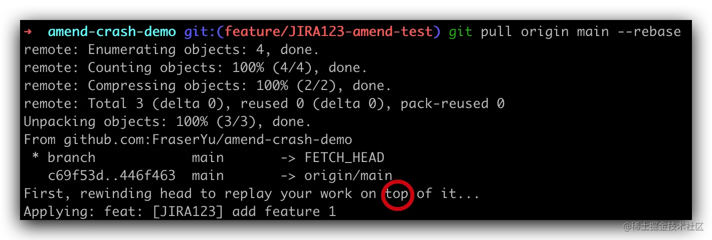 我这里使用 git pull origin main --rebase 省略了切换 main 并拉取最新内容再切回来的过程,一步到位,背后的原理都是上图展示的这样