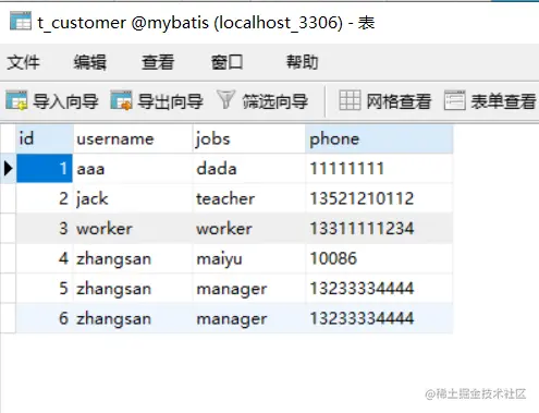 mybatis的数据库,在此数据库中创建一个t_customer表,同时预先插入几条数据。