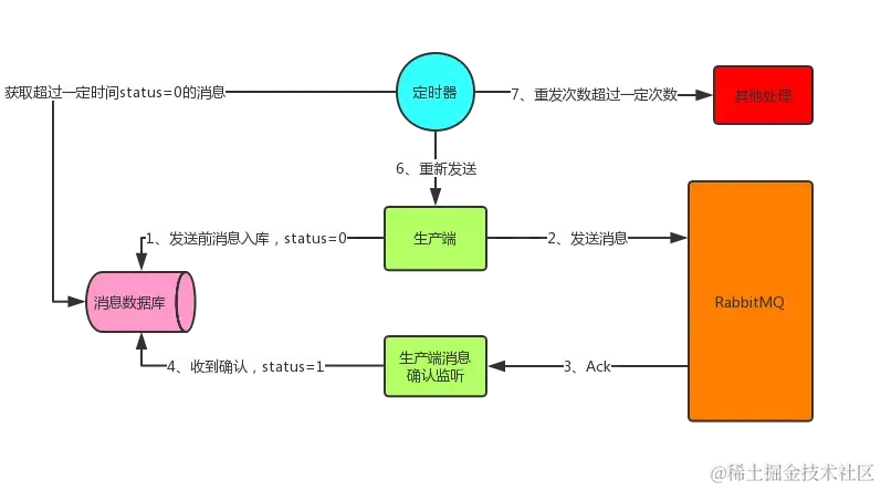首先发送消息前先将消息保存到数据库中,有一个状态字段status=0,表示生产端将消息发送给了RabbitMQ但还没收到确认。在生产端收到确认后将status设为1,表示RabbitMQ已收到消息。
