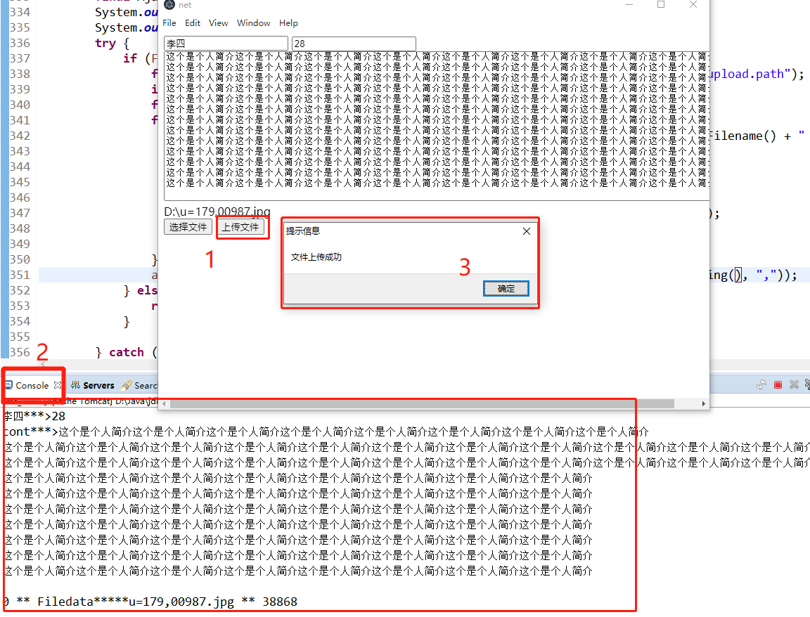 文件上传成功后,会弹出成功的提示框(3),java控制台也会显示提交过去的数据(2)