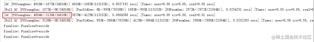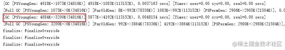 FinalizeOverride重写finalzie方法的注释去掉,执行上面的测试代码,先看gc信息: