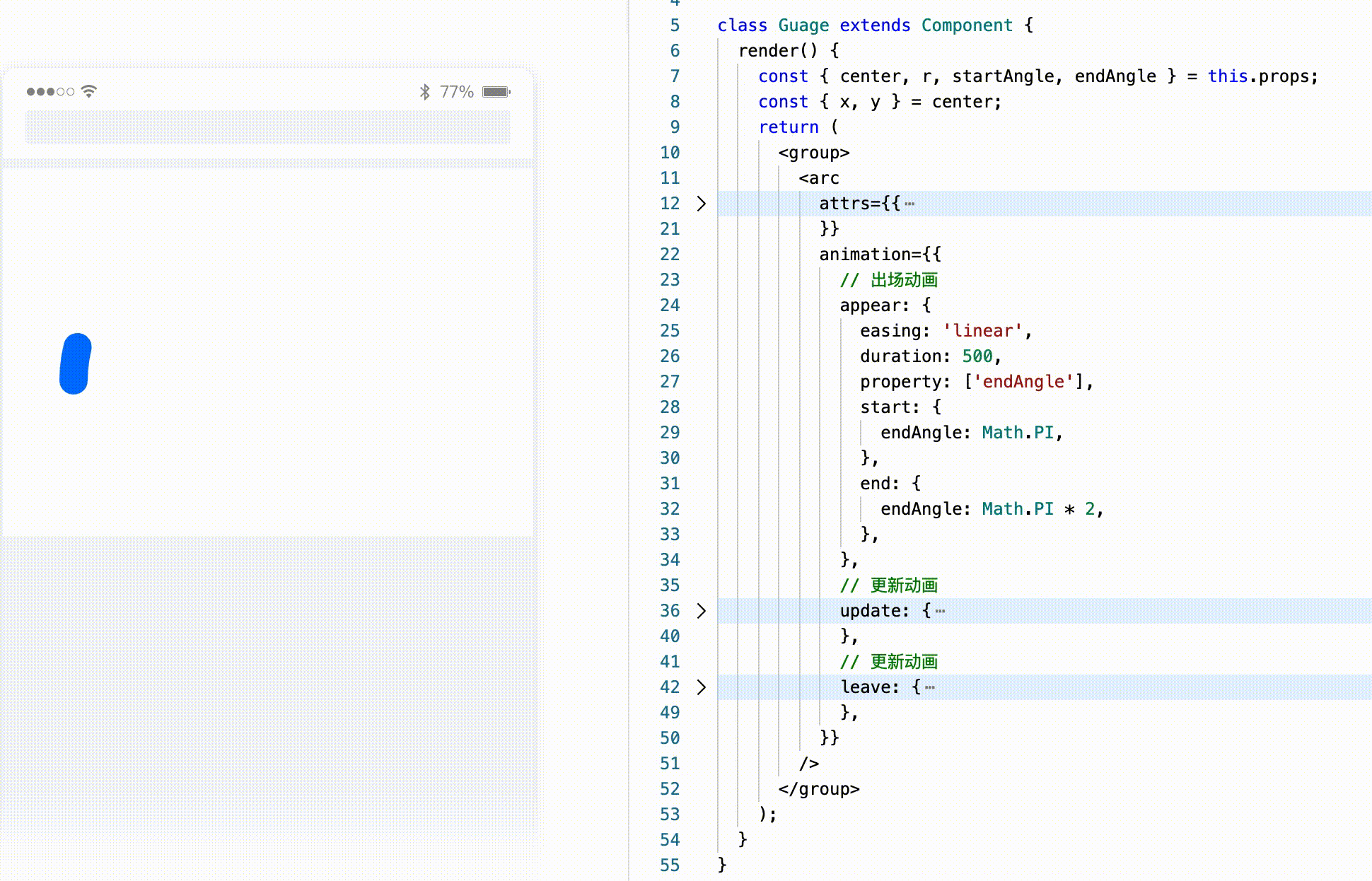 简单看一下动态排序柱状图的实现代码,非常简单,就是 Timeline 下面柱状图的连续变化,F2 内部会自动处理变化的图源并执行变化动画。