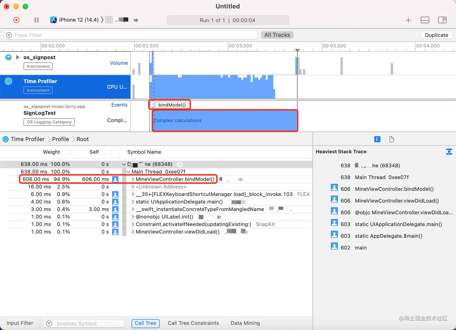 打开 Instruments,选择创建 Blank 模板,点击右上角,添加 "+" 号,双击选择添加 os_signpost 和 Time Profiler 两个模板。运行应用直到触发标记函数时停止,我们展开 os_signpost,找到我们创建的 SignLogTest,将其加到下方。调整 Time Profiler 的 Call Tree 之后就可以看到下图样式。