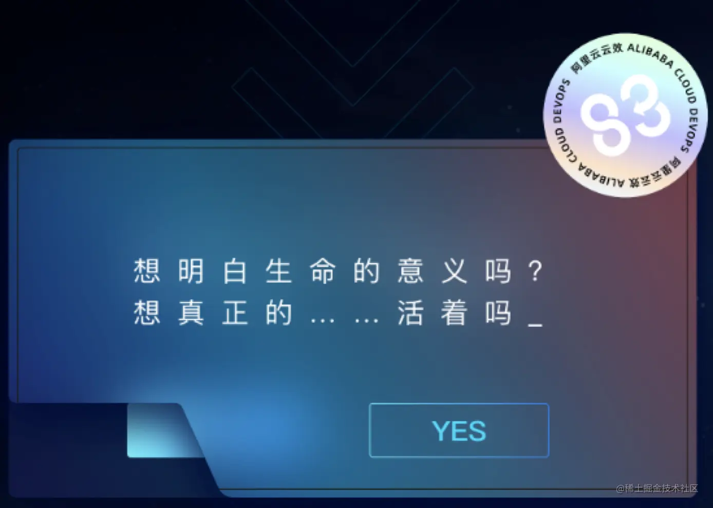 **最后一个问题:**怎么创造生命的意义?这个其实是稍微有一点难的,不像前两题这么直观,需要看完整个剧情,就会发现剧情里主要强调一点是技术的力量,第三段代码中也明确提到了在经历了人生的大转折之后,向往Technology的力量,学习了DevStudio的知识,Yunxiao的知识,Devops的知识,Cosy的知识,思考生命的价值。所以这一题的答案是技术(Technology),或者DevStudio、Yunxiao、Devops、Cosy都是可以的。