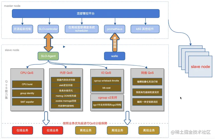混部通常是将不同优先级的任务混合在一起,例如高优先级的实时任务(对时延敏感,资源消耗低;称为在线)和低优先级的批处理任务(对时延不敏感,资源消耗高;称为离线),当高优先级业务需要资源时,低优先级任务需要立即归还,并且低优先级任务的运行不能对高优先级任务造成明显干扰。