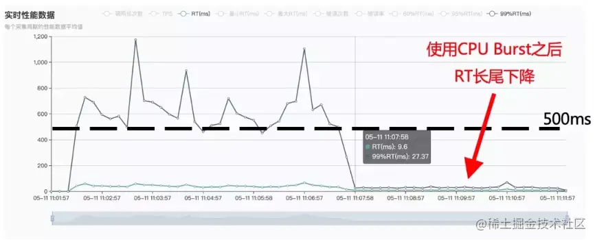 在容器场景中使用 CPU Burst 之后,测试容器的服务质量显著提升,如下图所示,在实测中可以发现使用该特性技术以后,RT长尾问题几乎消失。