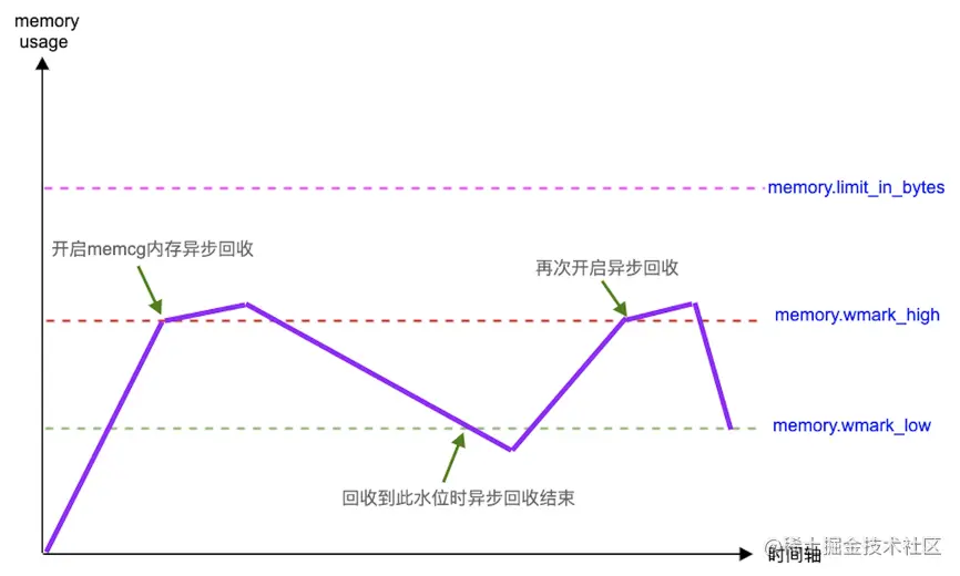 在原生的内核系统中,当容器的内存使用量达到上限时,如果再申请使用内存,则当前的进程上下文中就会进行直接内存回收的动作,这无疑会影响当前进程的执行效率,引发性能问题。那我们是否有方法当容器的内存达到一定水线的时候让其提前进行内存的异步回收?这样就有比较大的概率避免容器内的进程在申请使用内存时由于内存使用达到上限而进入直接内存回收。