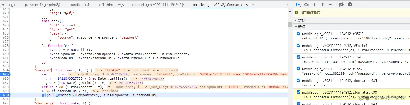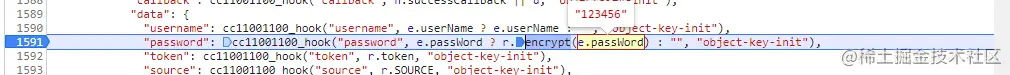 最后关掉hook,重新搜索关键词,定位到位置,打上断点,整体的加密逻辑应该就是这里了。