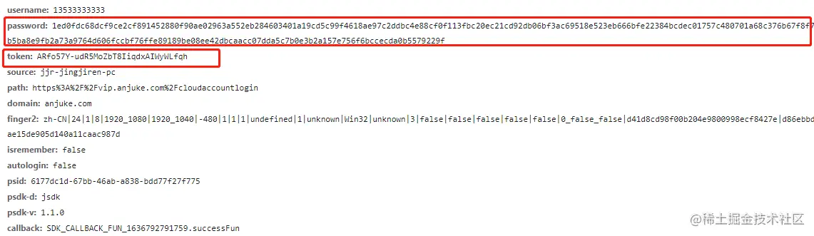 首先输入账号密码抓包,密码输入的123456,发现有两处加密参数,如下图: