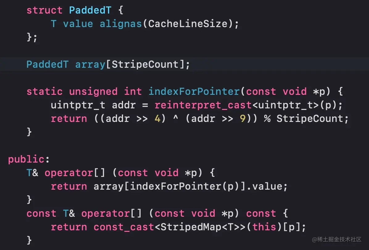 可以看到,StripeCount变量被用来创建一个类型为PaddedT的数组。在这里我们可以知道,SideTables实际上是一个存储了类型为T的变量的哈希表,它通过indexForPointer函数计算出指针的哈希值,可以看到哈希算法为((addr >> 4) ^ (addr >> 9)) % StripeCount;