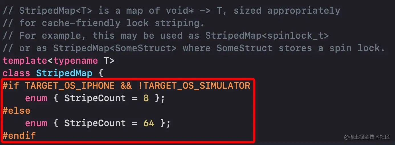 在上图的红色框部分,我们可以看到代码定义了StripeCount这个变量,该变量在IPhone真机上为8,在其他平台上为64.在接下来的代码中我们可以看到该变量的作用。
