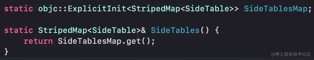 可以看到,SideTables是一个StripedMap<SideTable>类型的全局静态变量,实际上是调用了SideTablesMap.get()函数,该函数定义在objc::ExplicitInit类中。