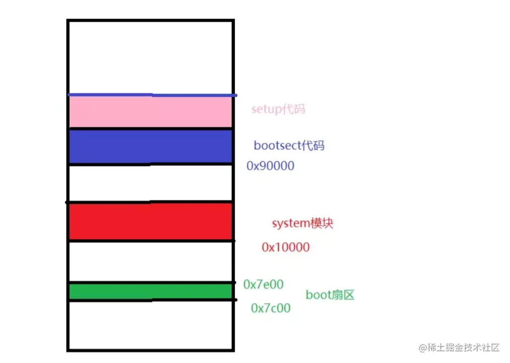 bootsect中的代码首先移动到0X7C00,之后又转移到0X90000。