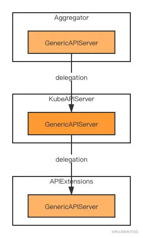 三个 APIServer 通过 delegation 的关系关联,在 kube-apiserver 初始化创建的过程中,首先创建的是 APIExtensionsServer,它的 delegationTarget 是一个空的 Delegate,即什么都不做,继而将 APIExtensionsServer 的 GenericAPIServer,作为 delegationTarget 传给了 KubeAPIServer,创建出了 KubeAPIServer,再然后,将 kubeAPIServer 的 GenericAPIServer 作为 delegationTarget 传给了 AggregatorServer,创建出了 AggregatorServer,所以他们之间 delegation 的关系为: Aggregator -> KubeAPIServer -> APIExtensions,如下图所示: