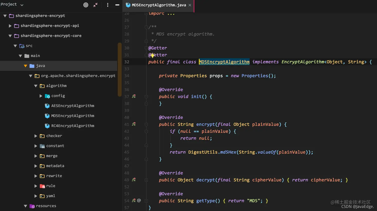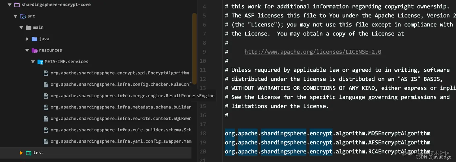 sharding-jdbc 可不会这么蠢,首先提供出 EncryptAlgorithm 加密算法接口,并引入 SPI 机制,做到服务接口与服务实现分离的效果。