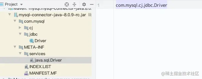 一般要根据自己使用的数据库驱动jar包,比如我们最常用的MySQL,其mysql-jdbc-connector.jar 里面就有: