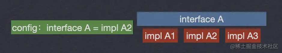 如下系统运行时,加载配置,用实现A2实例化一个对象来提供服务: