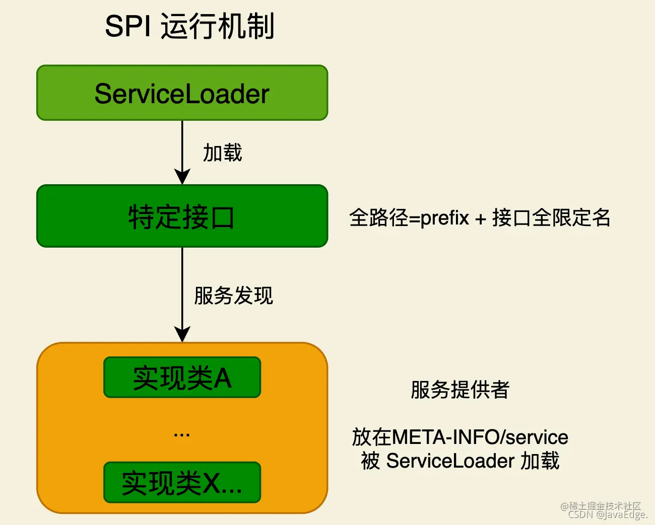 如某接口有3个实现类,那系统运行时,该接口到底选择哪个实现类呢? 这时就需要SPI,根据指定或默认配置,找到对应实现类,加载进来,然后使用该实现类实例。
