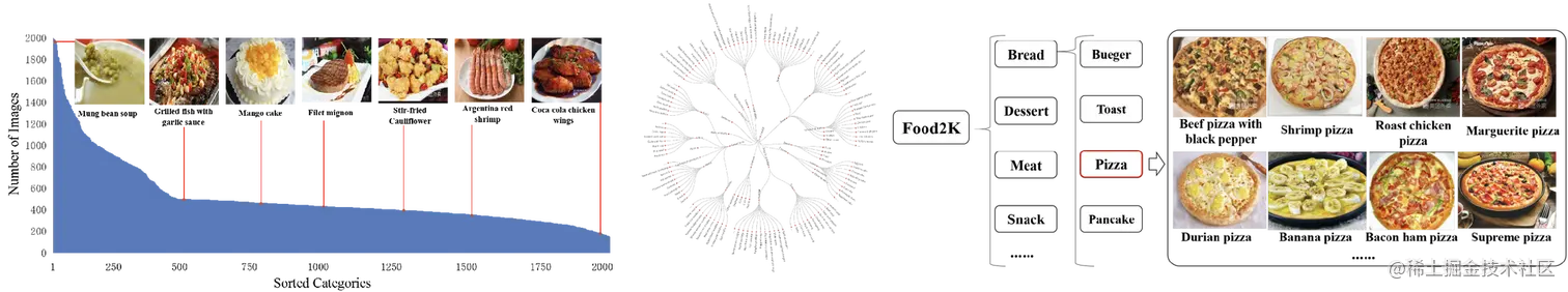 作为国内领先的生活服务平台,美团率先提出借助计算机视觉算法对食品图像进行细粒度分析,快速响应和满足商户和用户大量多样的在线食品图像审核、管理、浏览、评价等需求。两个赛道的数据集均源自美团自建菜品图像数据集“Food2K”,包含1,500个类别和大约800,000张图像。其中每张图像均由不同个人,采用不同设备,在不同环境场景下拍摄获取,是难得的可以公正评价算法鲁棒性和效果的图片数据。相比其他主流食品图像识别数据集,“Food2K”完全人工标注,噪声比控制在1%以内,数据分布与真实场景相符,并构建了统一的食品划分标准体系,该体系涵盖中西方12大类食品下属的2000类食物(以披萨为例,细分为如鲜虾披萨、榴莲披萨等类别)。