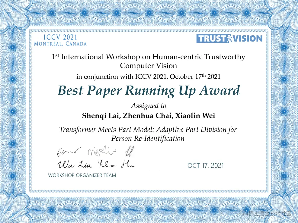 另外,同样在ReID领域的HTCV研讨会上,获得最佳论文提名奖: