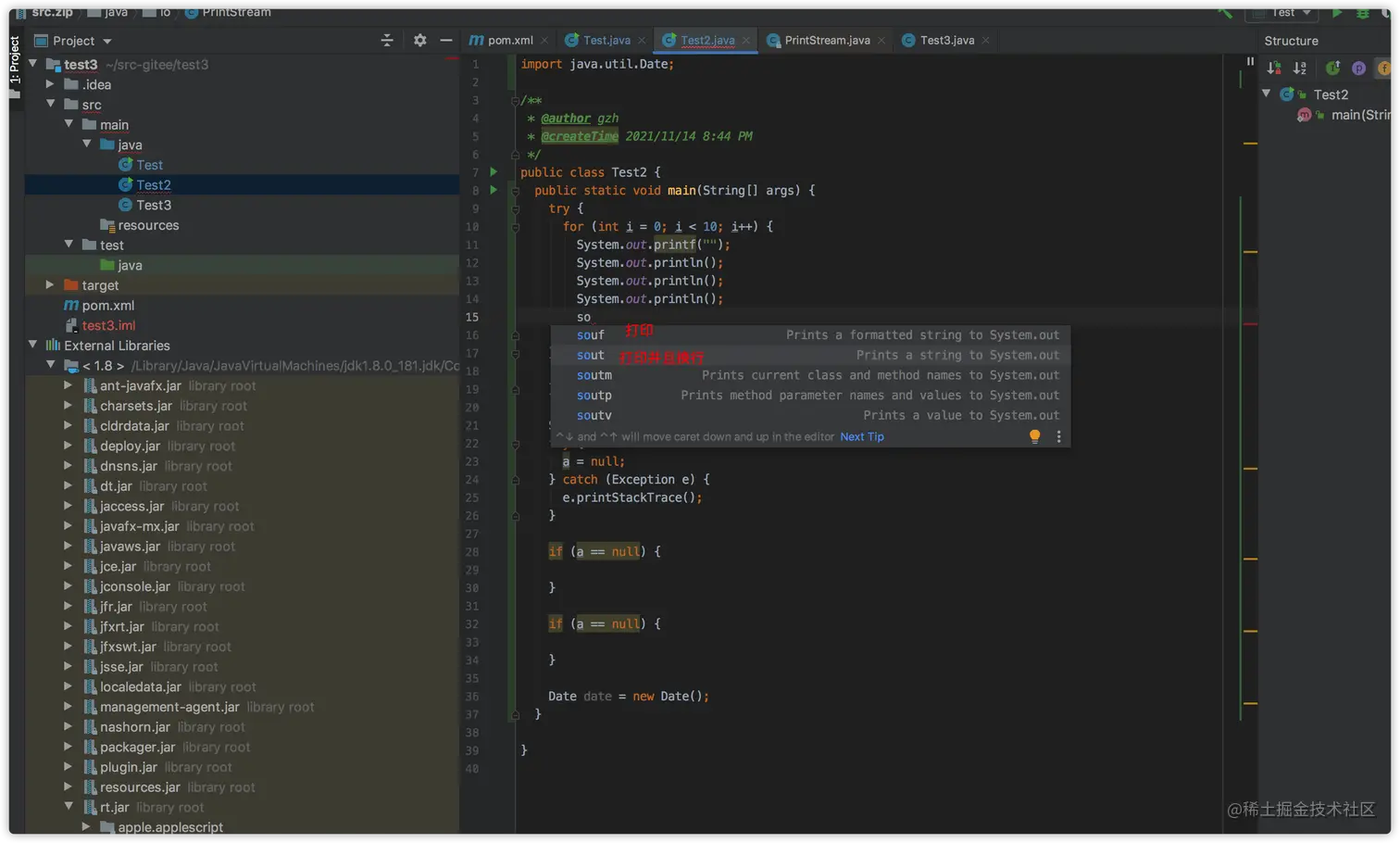 so是system.out的首字母。