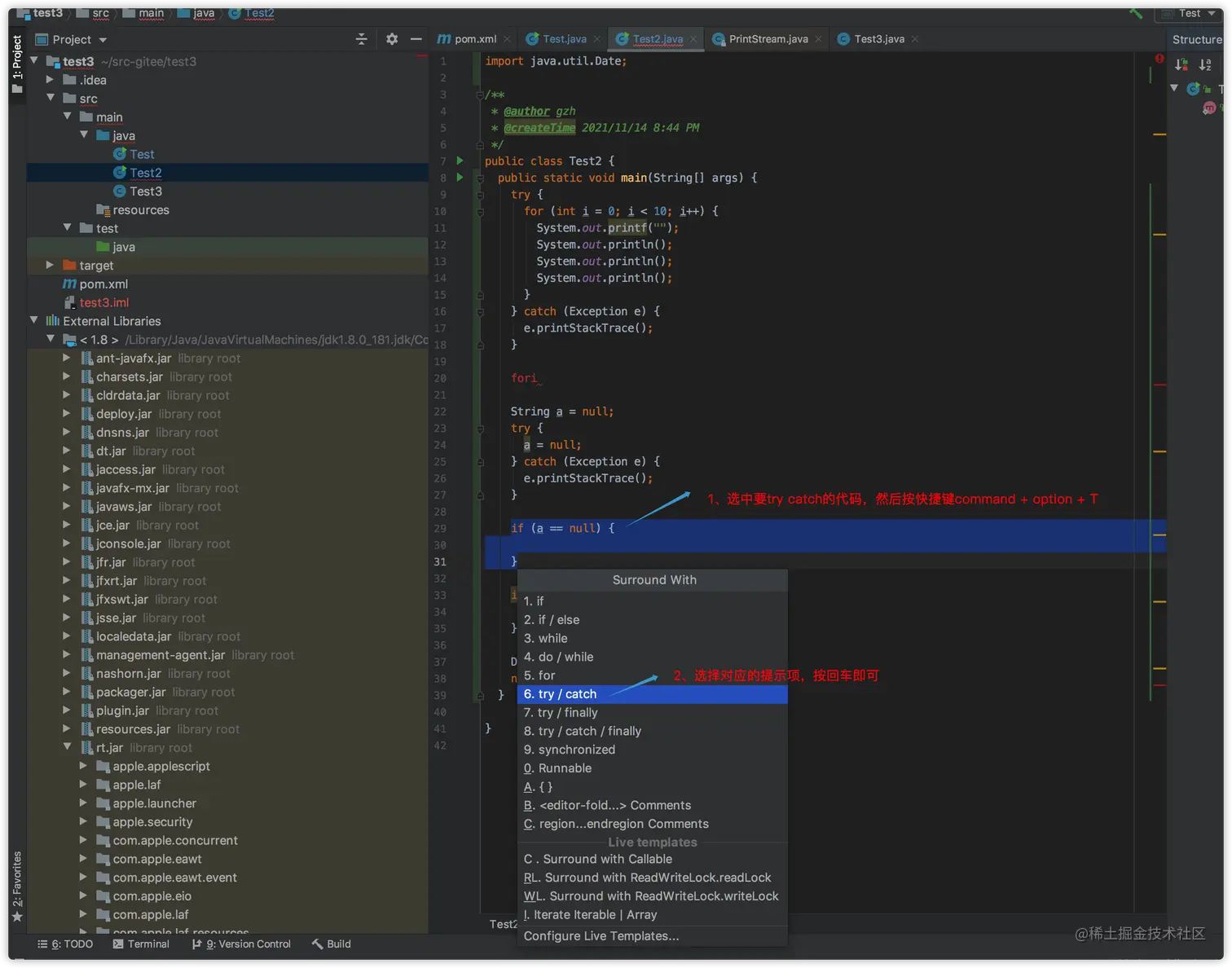- 先选中要try catch的代码,然后按快捷键command + option + T