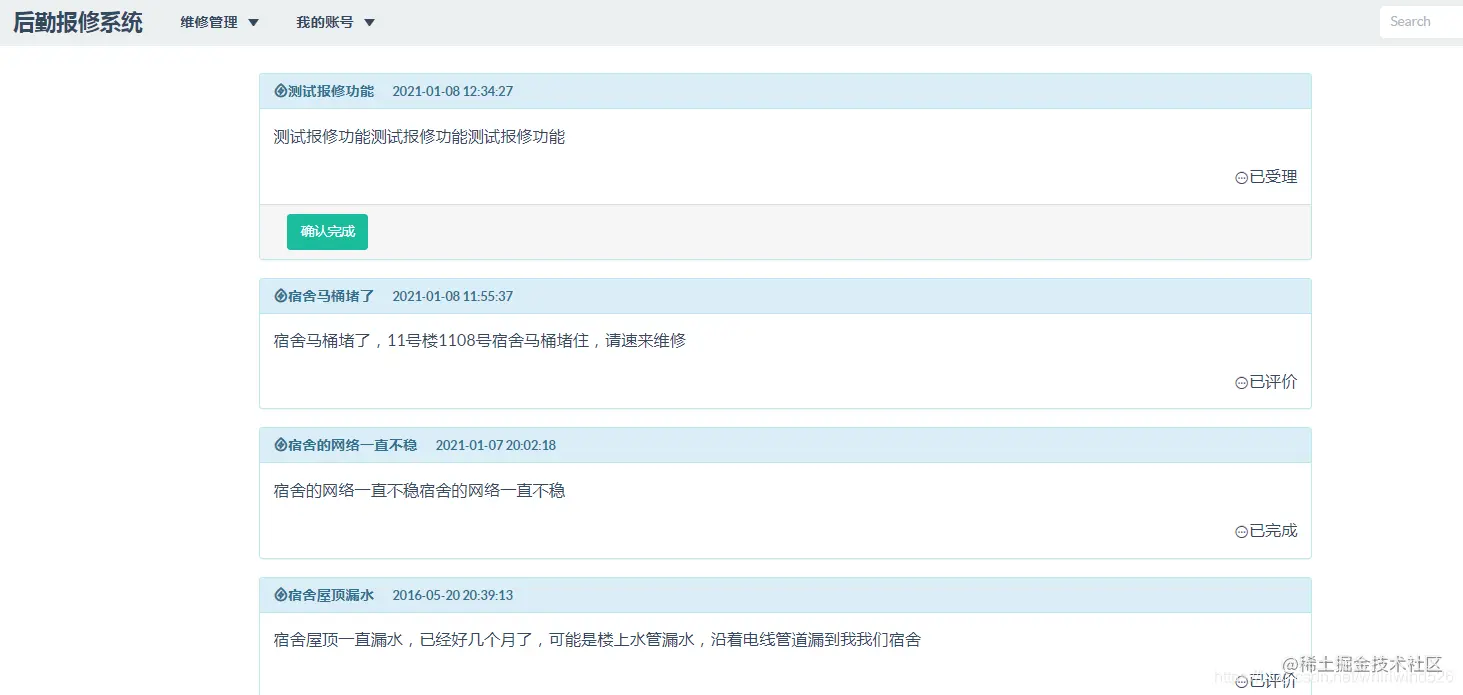 - 报修系统首页:可以根据时间和状态进行搜索报修记录