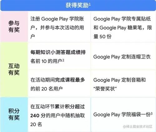 完成进阶计划,您将有机会赢得 Google Play 定制音箱、Google Play 定制连帽卫衣、Google 周边大礼包等精美礼品。快来报名吧!