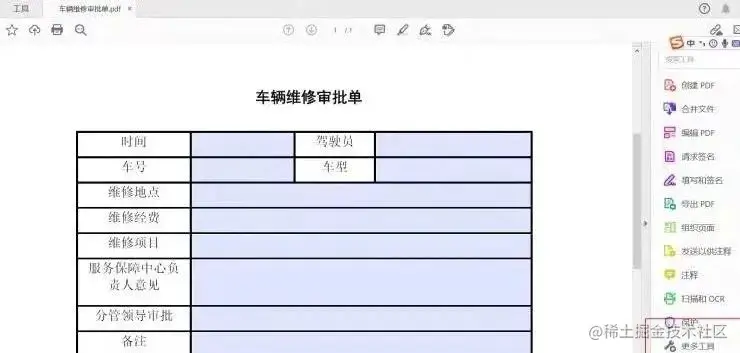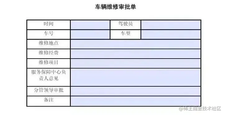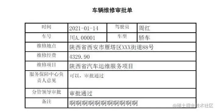 假定我们实体类什么的都已经编写完成、数据通过前端传入获取、模板位置在E盘根目录下名字为:车辆维修审批单.pdf