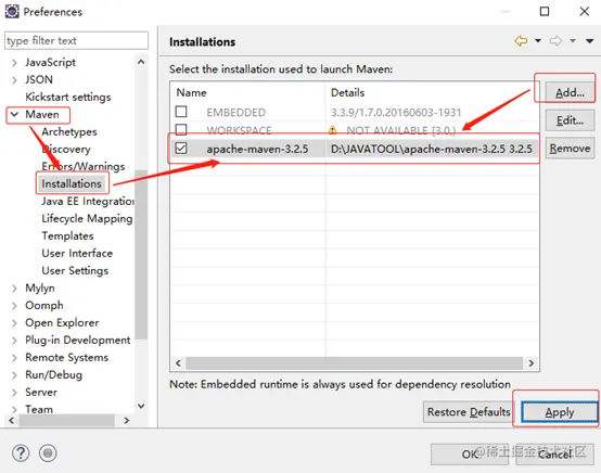 在Eclipse中搜索maven—Installations—Add,选择对应的Installation home路径,将maven的安装路径Add到项目的Maven路径中: