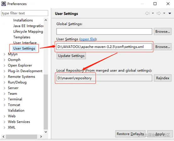 同时设置User Settings路径,Local Repository为settings.xml中配置的本地仓库: