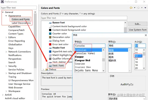 修改方式:Window→Preferences→General→Appearance→Colors and Fonts→Text Font→consolas,设置成12→Apply.