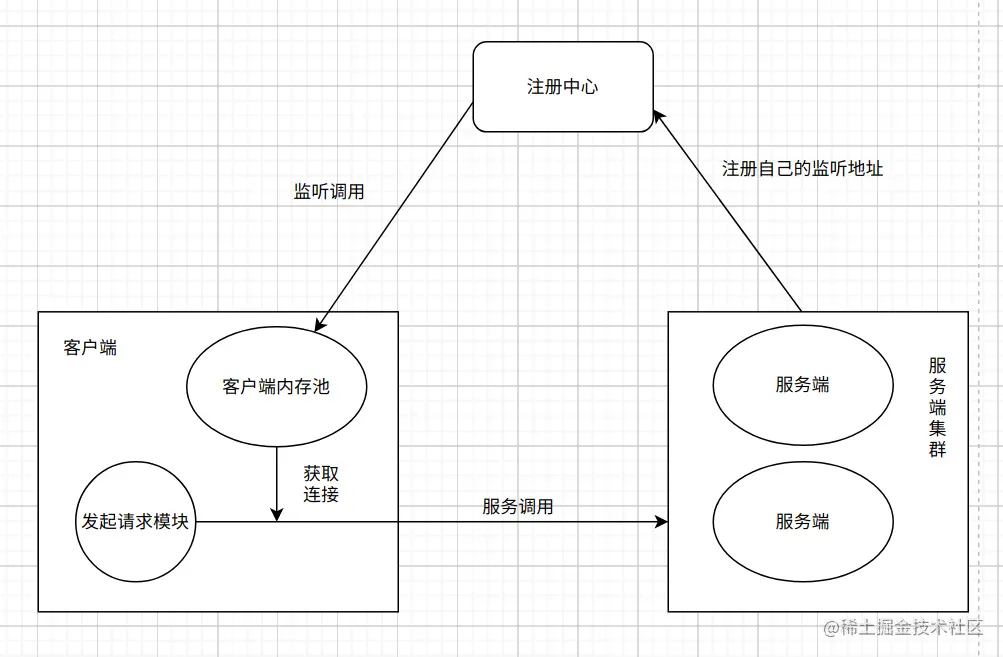 在实际场景中,图中的注册中心一般都是3个以上的节点组成的集群, 通过集群提供了一个稳定的服务, 服务端在启动的时候会把自己的监听端口通过对应的协议发送到注册中心, 而客户端会在启动的时候从注册中心获取到对应的地址放在内存中, 用户每次调用服务的时候客户端都会从内存中获取对应的地址, 并通过负载均衡等服务治理功能后把请求发送到某个服务中。