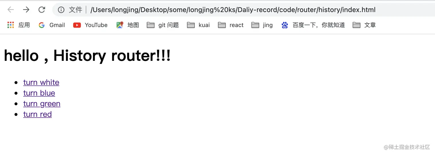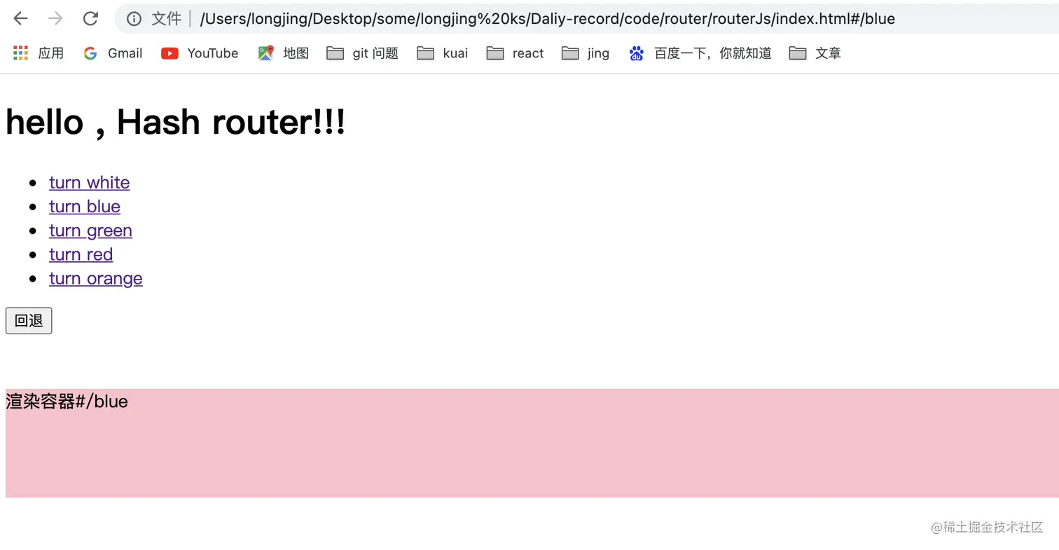 - 可以通过设置 a 标签,并通过设置 href 属性,例如 href = '#/blue',当点击标签的时候,url 的 hash 值发生改变,在当前 url 的后面加上‘#/bule’,同时触发 hashChange,再回调函数中进行处理