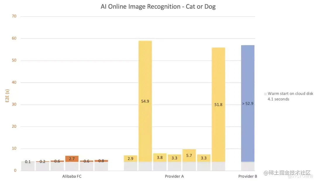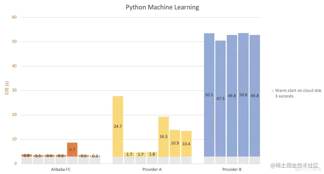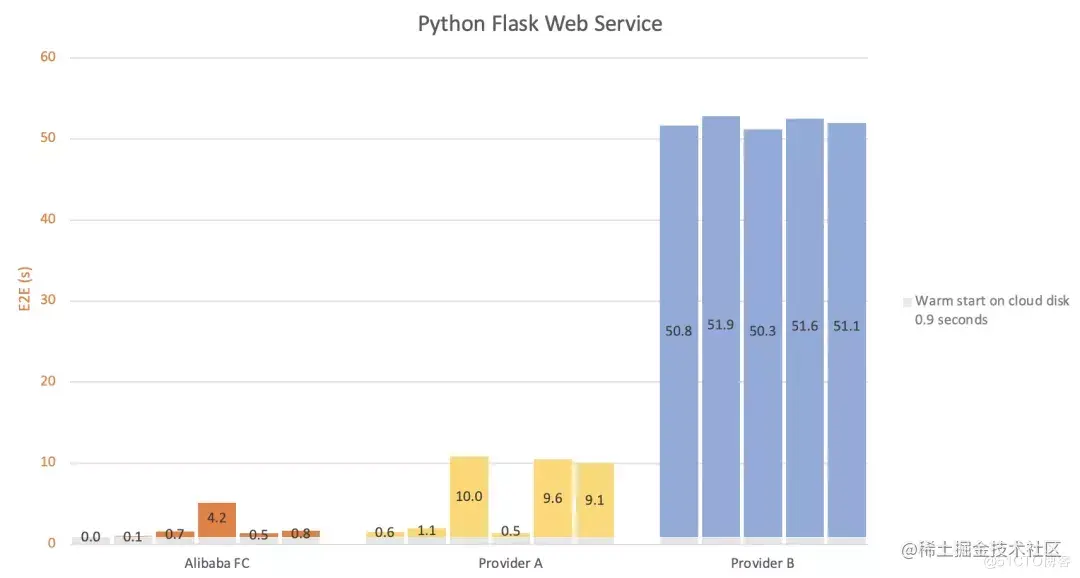 以云盘热启动为基准(灰色),对比各个厂商的额外开销(彩色)