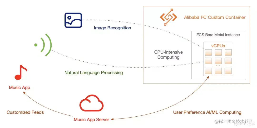 推理类计算依赖大体积底层训练框架以及大量的数据处理,普通的 AI 框架如 Tensorflow 的镜像可以轻松达到 GB 级,对 CPU 要求已经很高,要再满足扩缩容就更是挑战。函数计算自定义镜像可以很好的解决此类需求,用户只需直接使用底层训练框架镜像并与数据处理逻辑打包至新的镜像内便可以轻松省去更换运行环境所带来的移植开销,同时又可以满足弹性扩缩容带来的快速训练结果。歌曲喜好推理、图片 AI 识别分析等都可以无缝与函数计算衔接以达到弹性满足大量动态的在线推理请求。