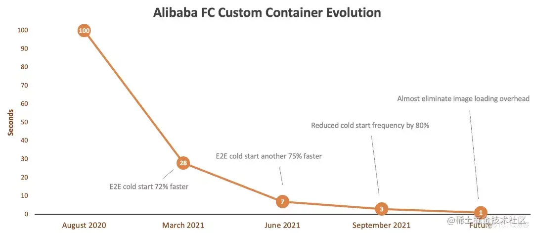 函数计算在 2020 年 8 月创新地提供了容器镜像的函数部署方式。AWS Lambda 在 2020 年 12 月 Re-Invent,国内其他 FaaS 提供商在 2021 年 6 月也相继宣布了 FaaS 支持容器的重磅功能。冷启动一直都是 FaaS 的痛点,引入比代码压缩包大几十倍的容器镜像后冷启动恶化便成为开发者最大的担忧。