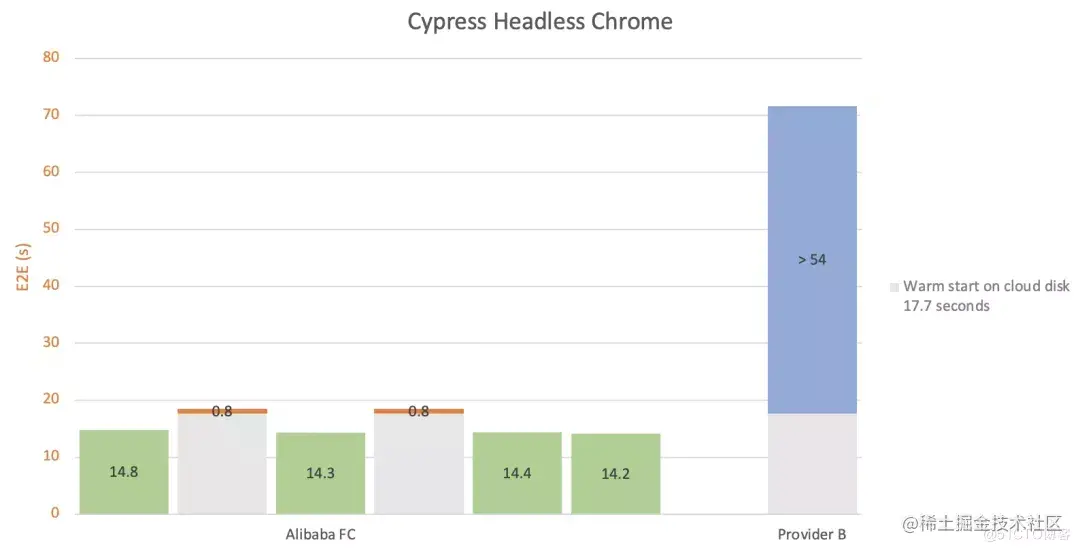 此镜像包含无头浏览器测试流程,厂商 A 由于编程模型限制和运行环境不兼容无法运行。而厂商 B 过慢只能在规定时间内耗时 71.1 秒完成应用初始化。不难看出函数计算在重 I/O 的镜像方面依然有着不错的表现。
