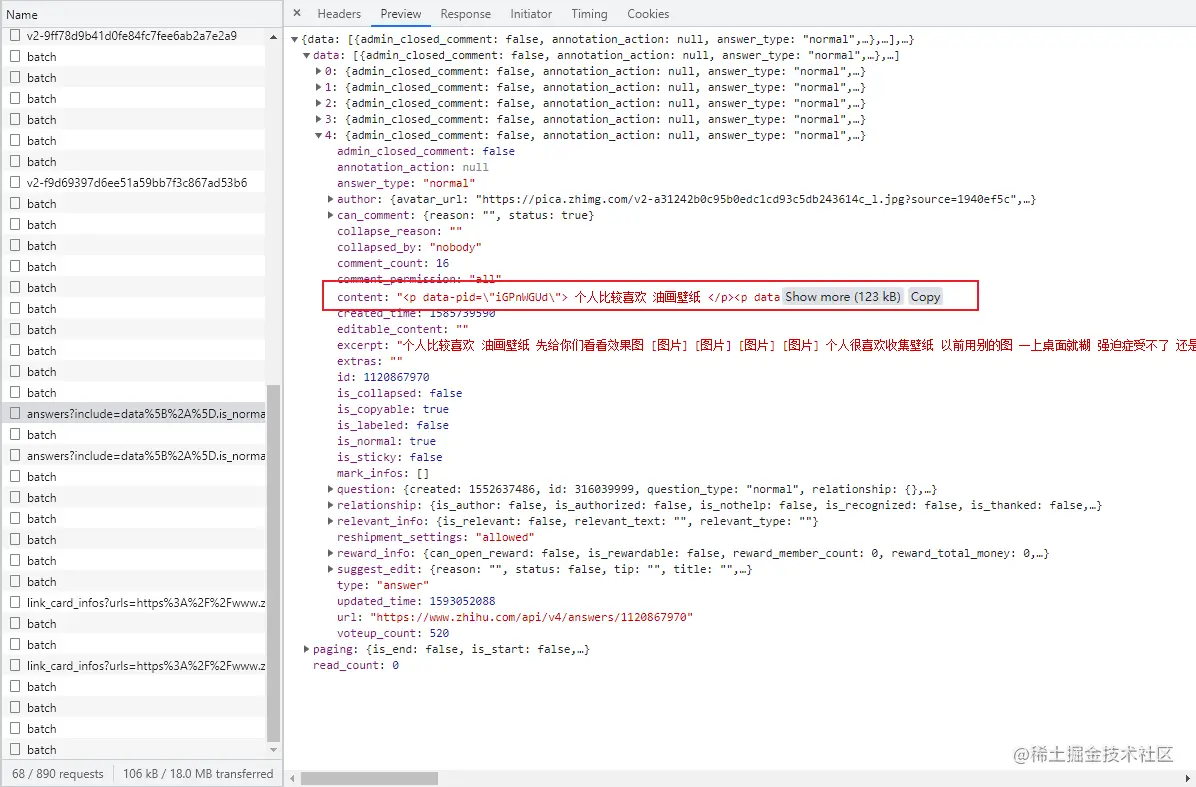 经过之前的分析,我们知道,知乎网站的回答数据,是通过 Ajax 动态加载的,每次页面划到底部时,请求新的5条数据进行加载,接口如下图所示。