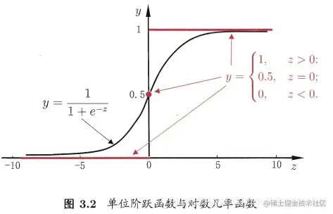 对于分类任务,只需找一个单调可微函数将分类任务的真实标记y与线性回归模型的预测值联系起来。考虑二分类任务,其输出标记,而线性回归模型产生的预测值是实值,于是,只需将实值转换为0/1值。最理想的是“单位阶跃函数”
