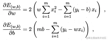 求解w和b使得均方误差最小化的过程,称为线性回归模型的最小二乘“参数估计”。我们将均方误差分别对w和b求导,得到