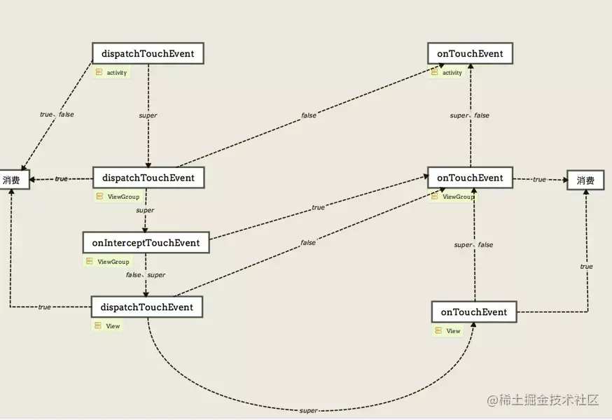 2.返回值为false的情况:对于dispatchTouchEvent和onTouchEvent,除了Activity返回值为false表示自己消费了该事件,ViewGroup和View都会将事件传递给父控件的onTouchEvent来处理。而onInterceptTouchEvent返回值为false的时候代表不拦截,默认的super也是不拦截,继续传递给下层的dispatchTouchEvent来处理。