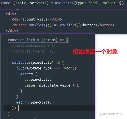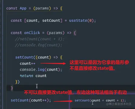 <button onClick={()=>{setCount((count)=>count+1)}}>click me</button> / 函数式更新