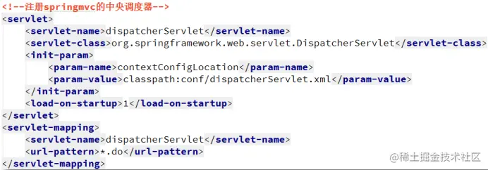- 配置中央调度器。将SpringMVC配置文件中的对象(Controller)全部加载到SpringMVC容器中。