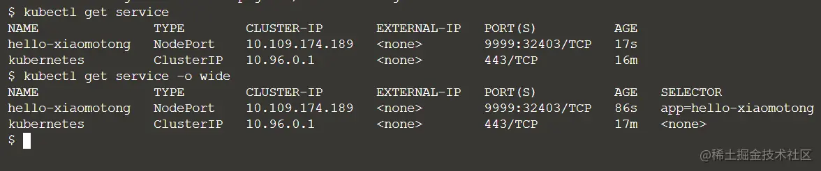$ kubectl expose deployment hello-xiaomotong --type=NodePort --port=9999
