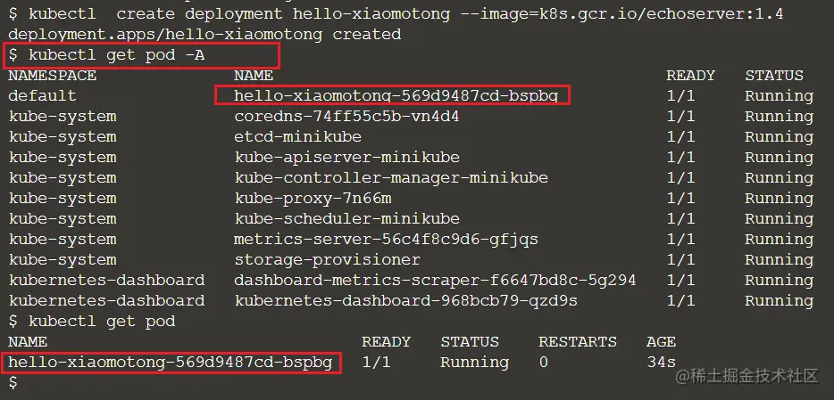 $ kubectl create deployment hello-xiaomotong --image=k8s.gcr.io/echoserver:1.4