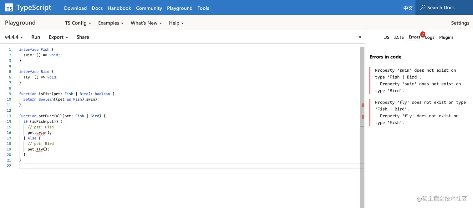 如果 isFish 方法的返回值定义不为 pet is Fish,而是 boolean,则 TypeScript 就无法做出正确的类型推导: