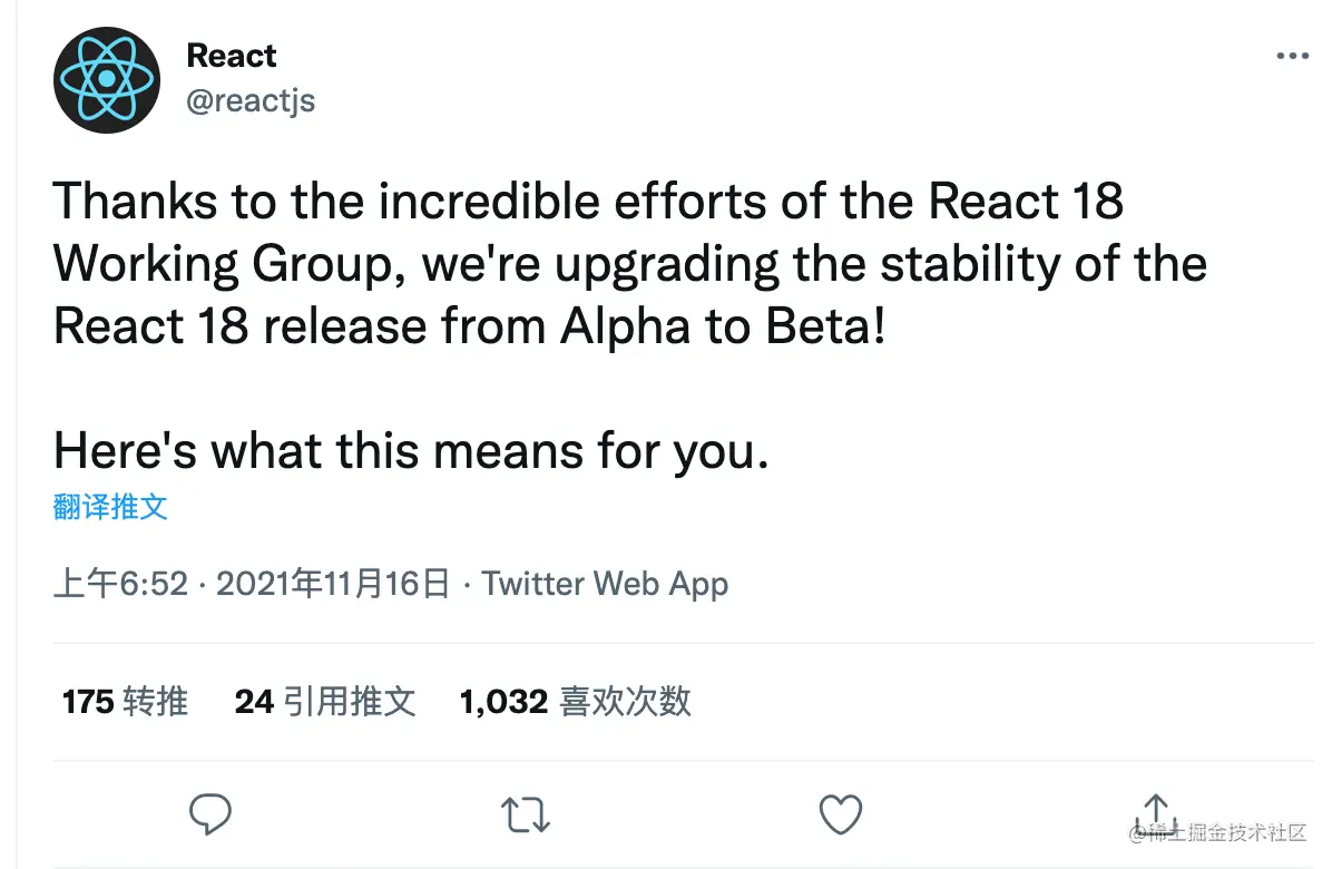 本月 16 日,React 官方发布 Twitter 宣布 React 18 由 Alpha 阶段进入 Beta 阶段: