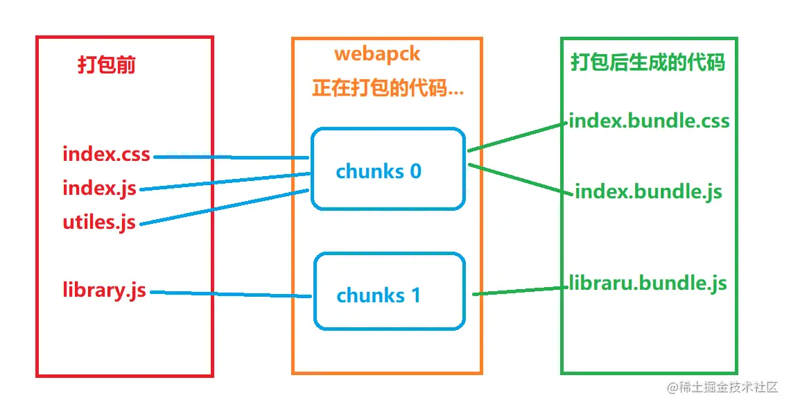 其中涉及到的 chunk 和 bundles 的概念,可以根据下图来辅助理解:
